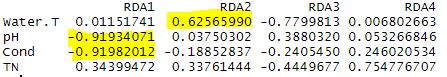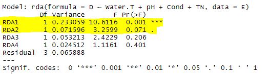 You will have to make some choices in your data while doing this process. You may even try the RDA model multiple different times to find the most significant model and the overall best outcome from your data. As you do this, check the variance inflation factor (VIF). The VIF is a measure of the amount of multicollinearity in a set of multiple regression variables. Variables with a VIF >10 should be avoided. For this model, I have chosen to use water temperature, pH, conductivity, and TN. I chose these because I am most interested in these specific variables, and they influence other ones that they are correlated with (e.g. conductivity and cations/anions)