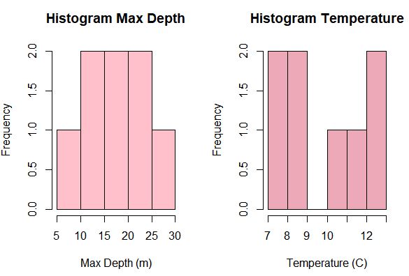 hist(env$Zmax, breaks = 5, col = "pink", xlab = "Max Depth (m)", main = "Histogram Max Depth")