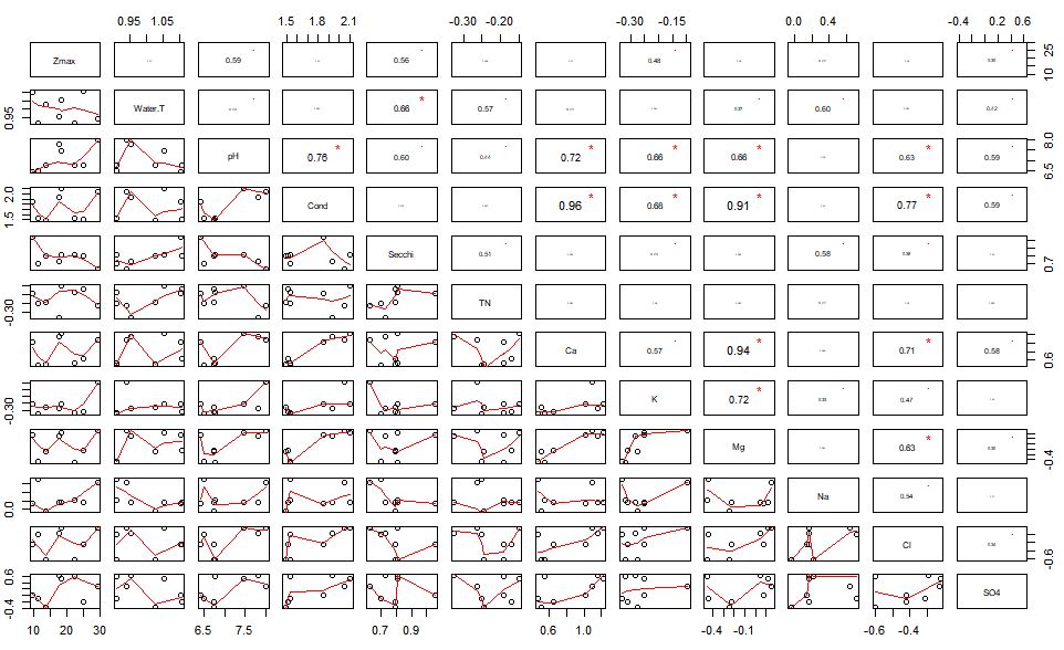 This creates a rather large panel of your environmental variables, their correlations, and the significance of those correlations.