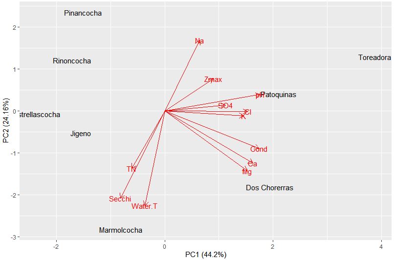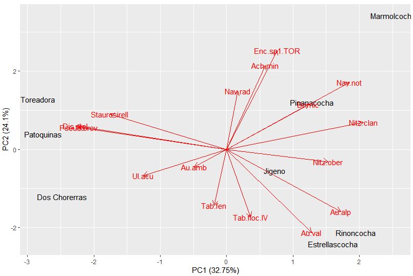 Note, for PC1 the most negative values correspond to Discostella stelligera and Pseudostaurosira, with the more positive values belong to Nitzschia clandestina and Aulacoseira alpigena. So lakes on the plot, like Dos Chorerras, Toreadora, and Patoquinas which have more positive site scores contain a higher abundance of the D. stelligera and Pseudostaurosira; while lakes with more negative scores have higher abundances of A. alpigena and N. clandestina. What can you find for PC2?