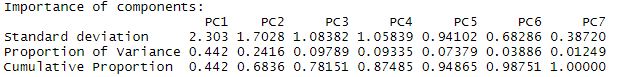 Again the summary shows us the breakdown of the components. Here, PC1 explains 44.2% of the total variance, and PC2 explains 24.16% of the total variance.
