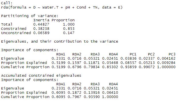 The summary will pop up the results above. The total variance is broken down into constrained and unconstrained components. In this global model, our explanatory variables explain 85.3% of the total variance, and there is 14.7% unconstrained. This means we have captured a pretty high percentage of the variance here with our explanatory data set. There are four constrained RDA axes, and three unconstrained PC axes.