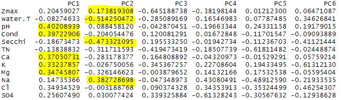 We can see that conductivity is related to a number of other variables including Ca, K, Mg, and Cl. Since conductivity is related to each of these individual cations – we can remove the cations from the analysis. I am crap at sub-setting still, but you can remove these variables from you dataset by individual column using the following function.